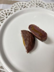 チョコでコーティングされたお餅の中にはさつまいもクリームが入っています。